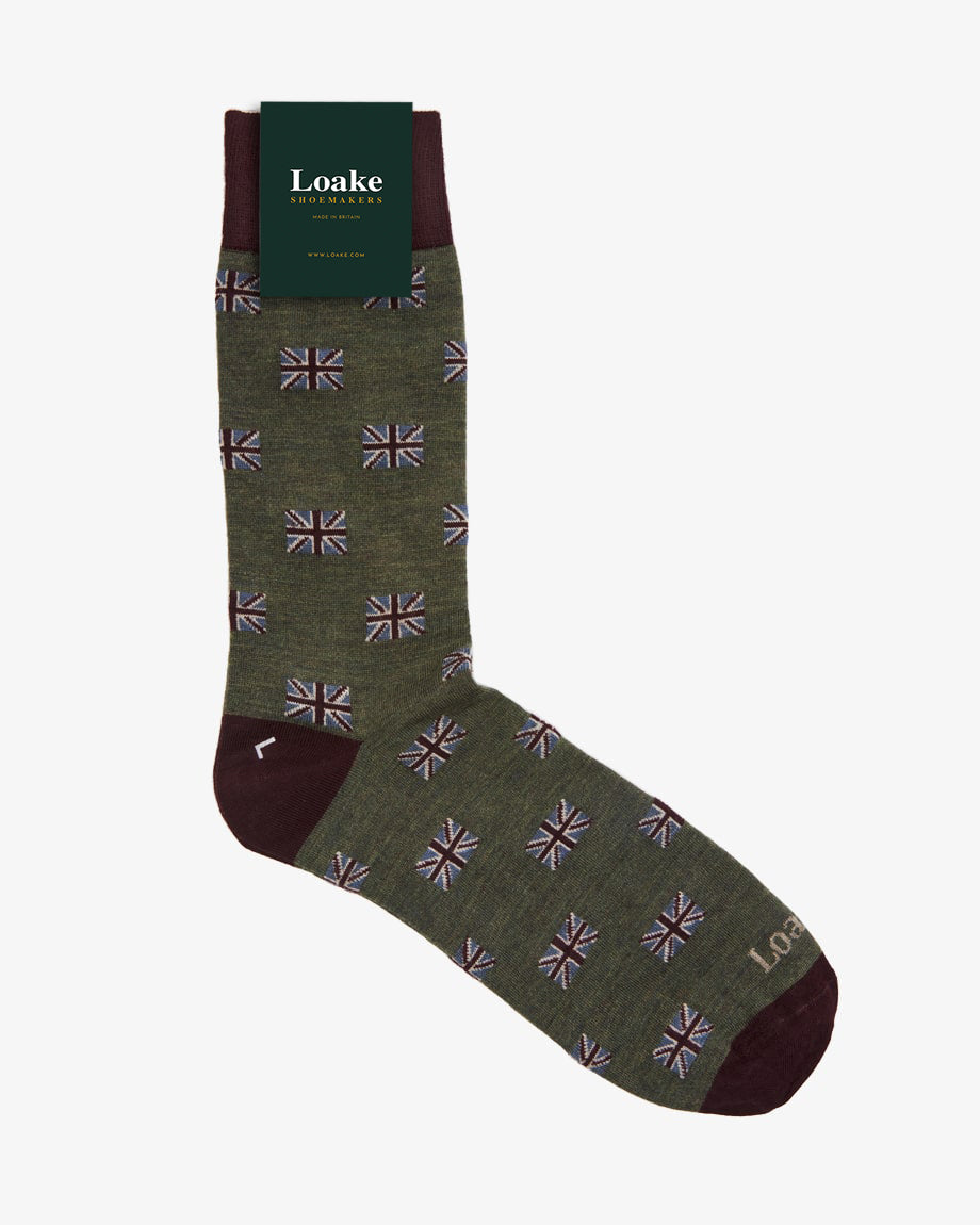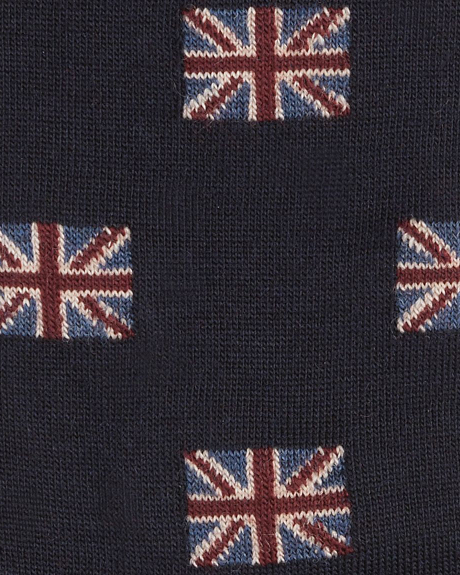 Premium wool socks with a navy background and Union Jack pattern. Made in Britain, from 63% wool and 37% nylon.