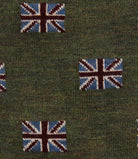 Premium wool socks with an olive green background and Union Jack pattern. Made in Britain, from 63% wool and 37% nylon.