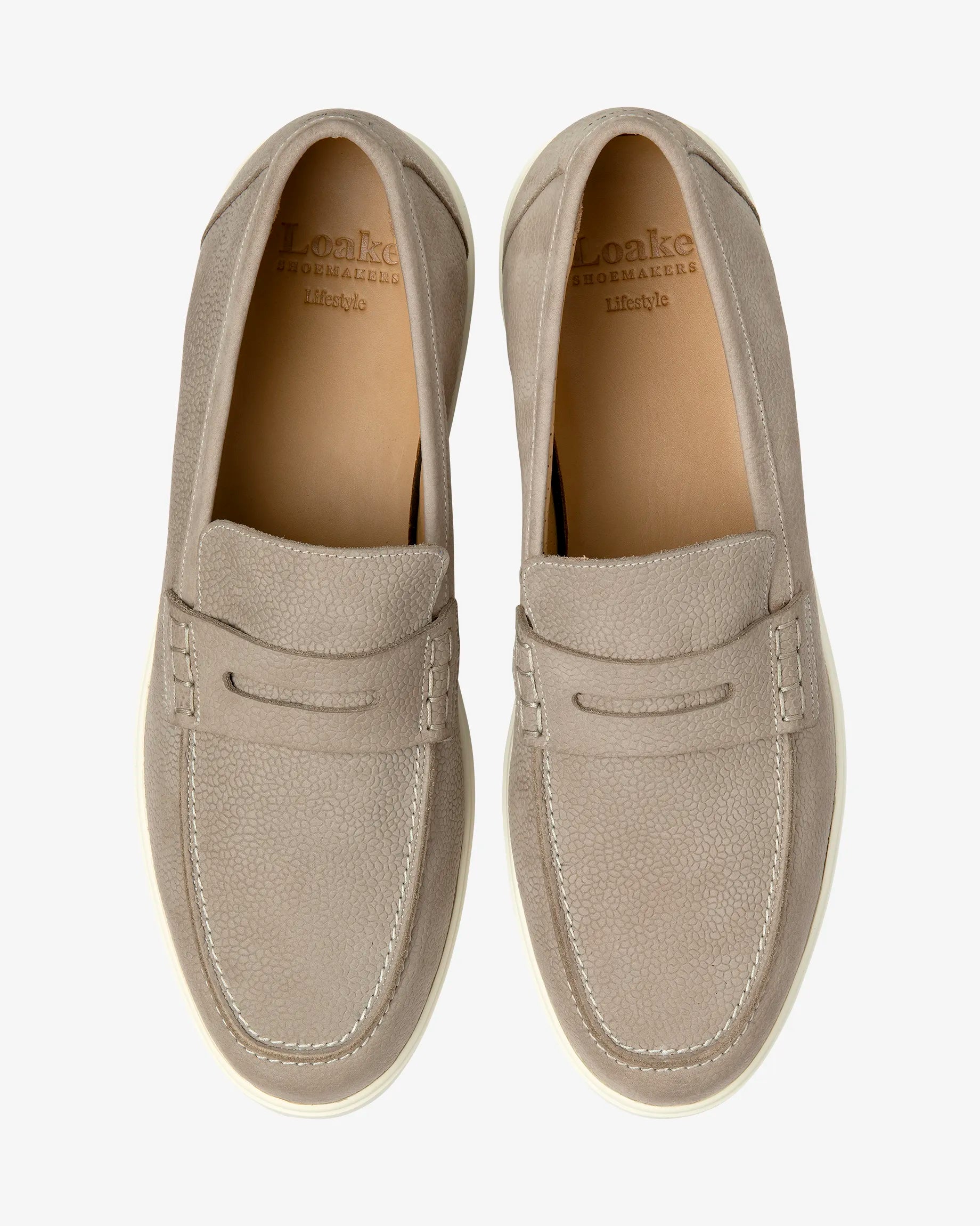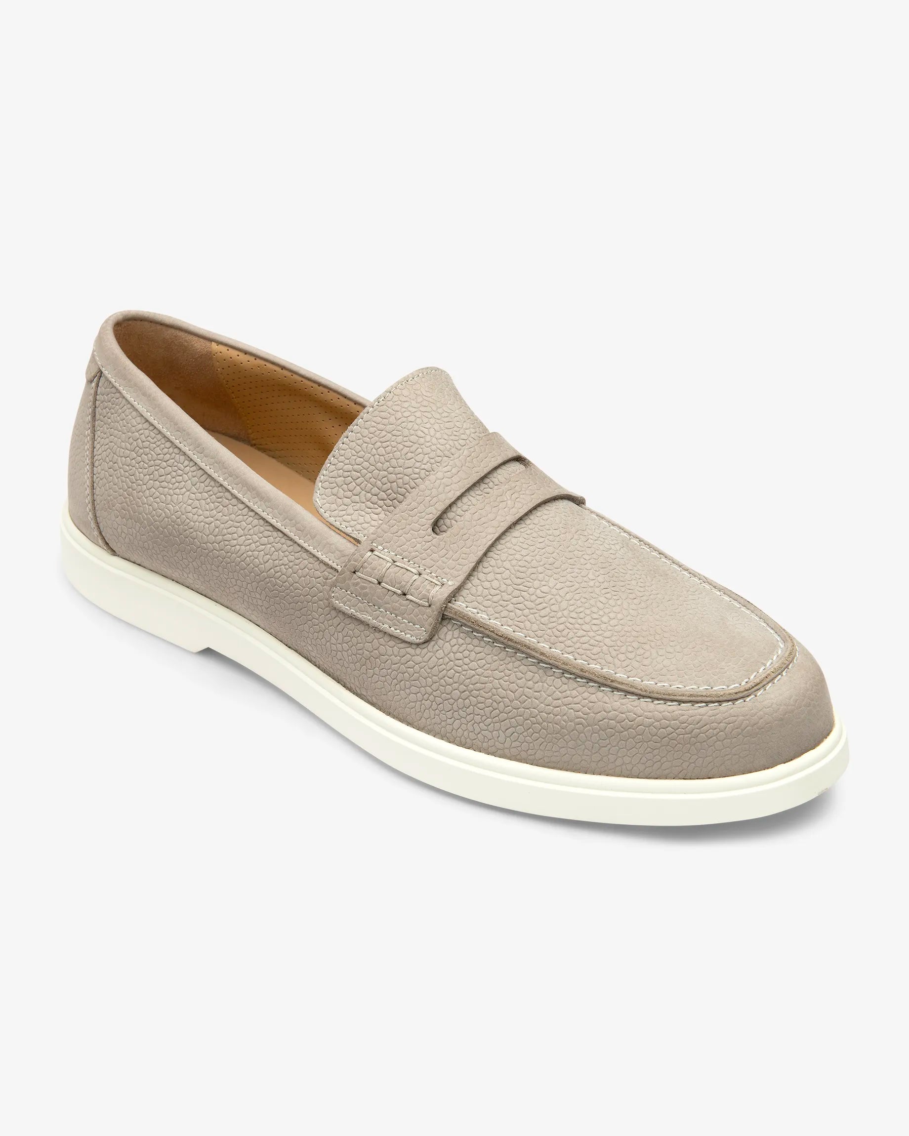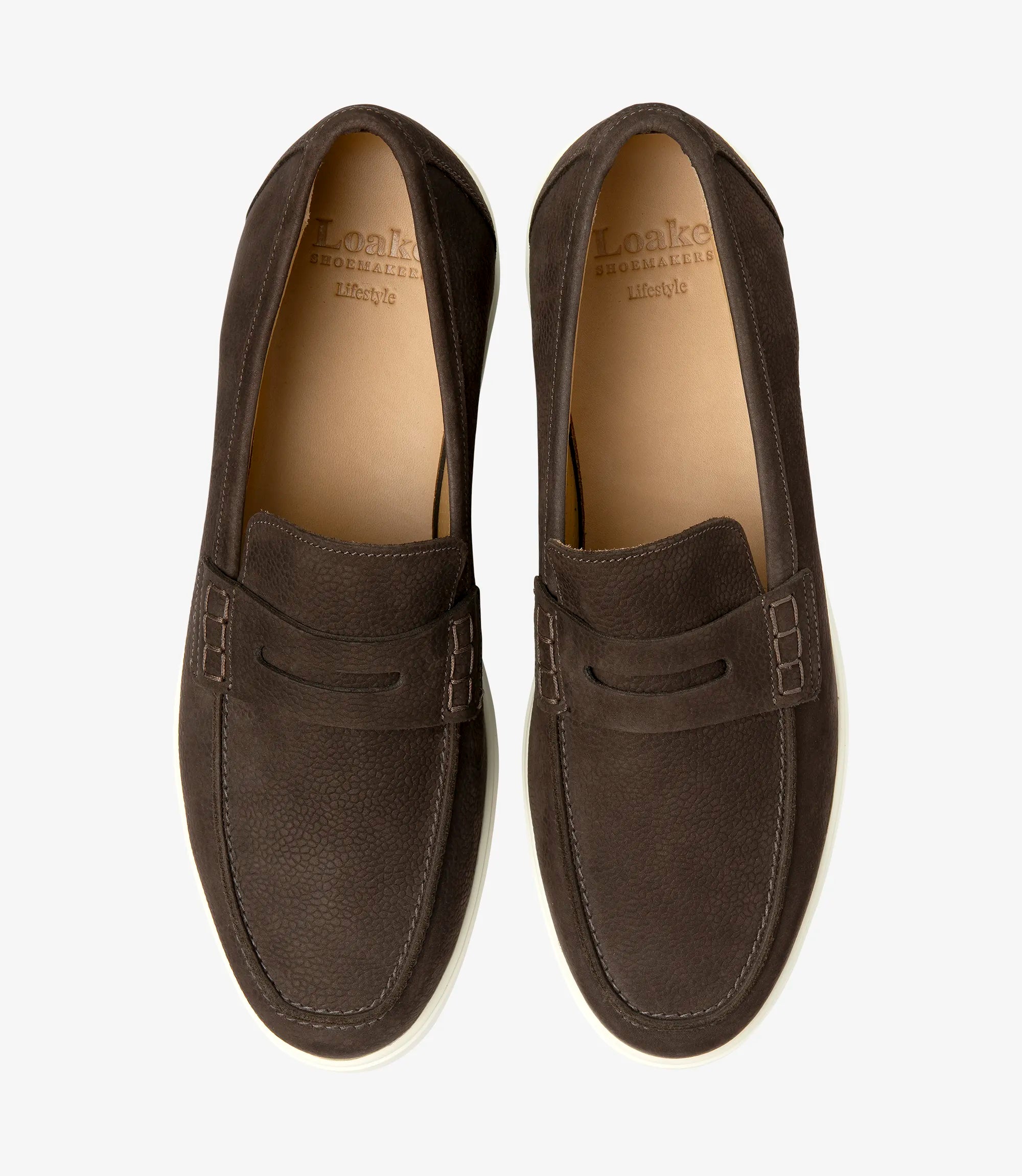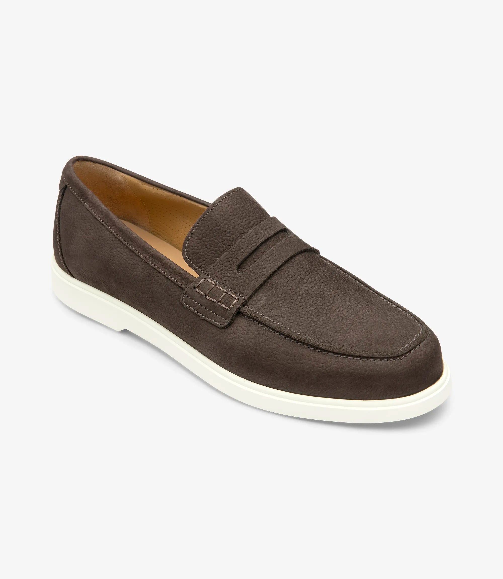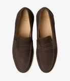 Como, a comfortable and soft penny loafer in dark brown nubuck. Completes any casual or summer outfit. Pair with shorts, light blue denim or linen trousers.
