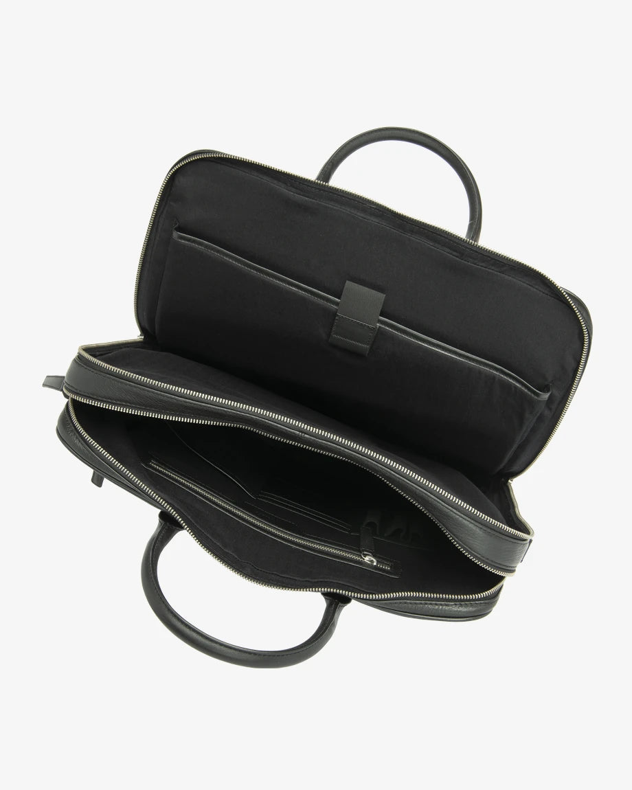 Westminster is our premium calf briefcase. Two big interior pockets with smart storing for pens, papers, computer and all your work necessities. One external zip pocket with attached key holder inside. Padded exterior for extra protection. Comes with detachable shoulder strap. These leather briefcases are designed and engineered in Kettering and made in our high-grade factory in India.