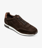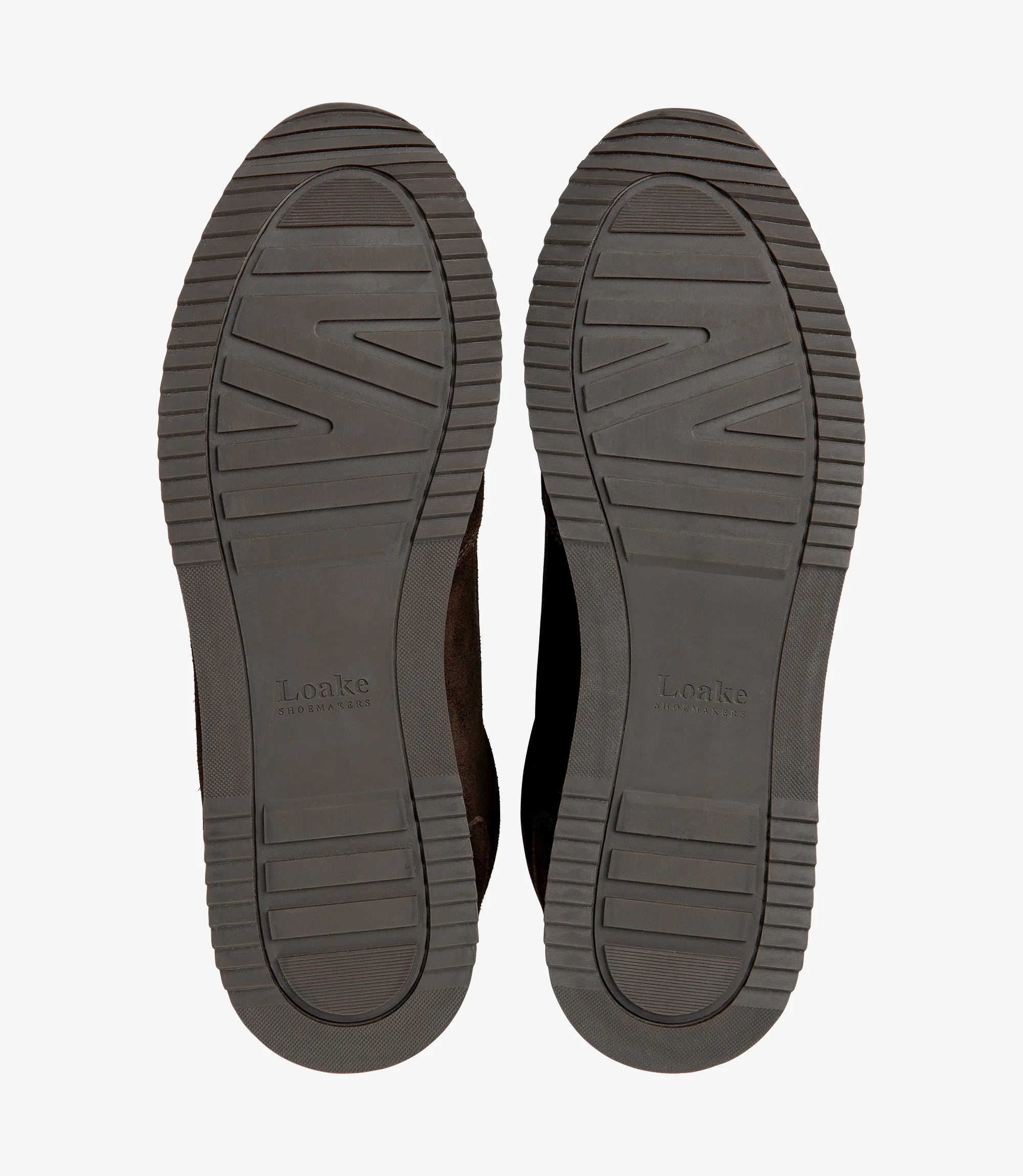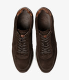 Dark Brown Suede trainer featuring cemented rubber soles. Bannister is fully leather lined and uses the Trainer last shape in F width.