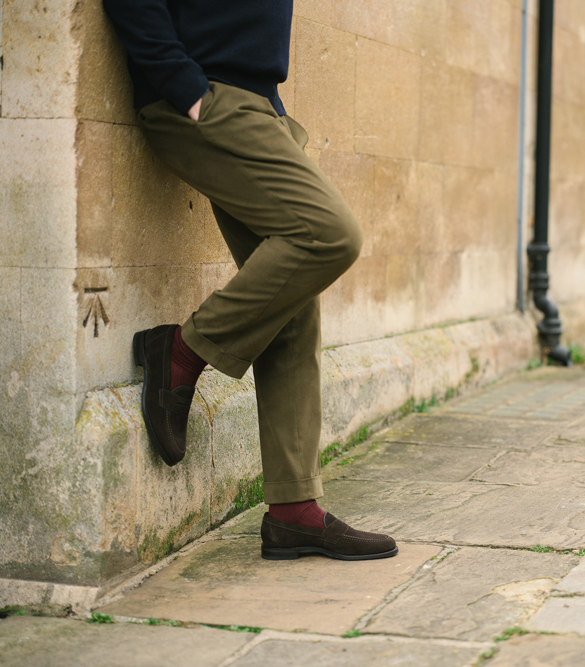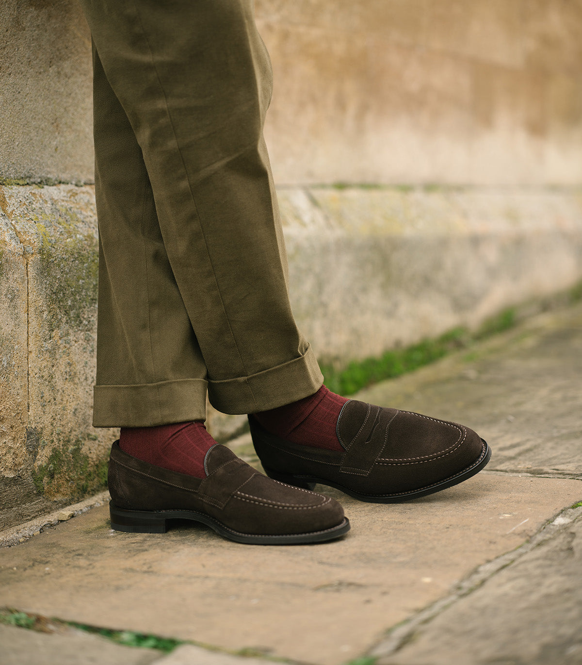 Our bestselling penny loafer. Now available in wide fit. Made on our new loafer last shape called College/G (wide). A soft almond toe shape last which suits both dressed and casual attire. This version features our slim Shadow Rubber Sole.